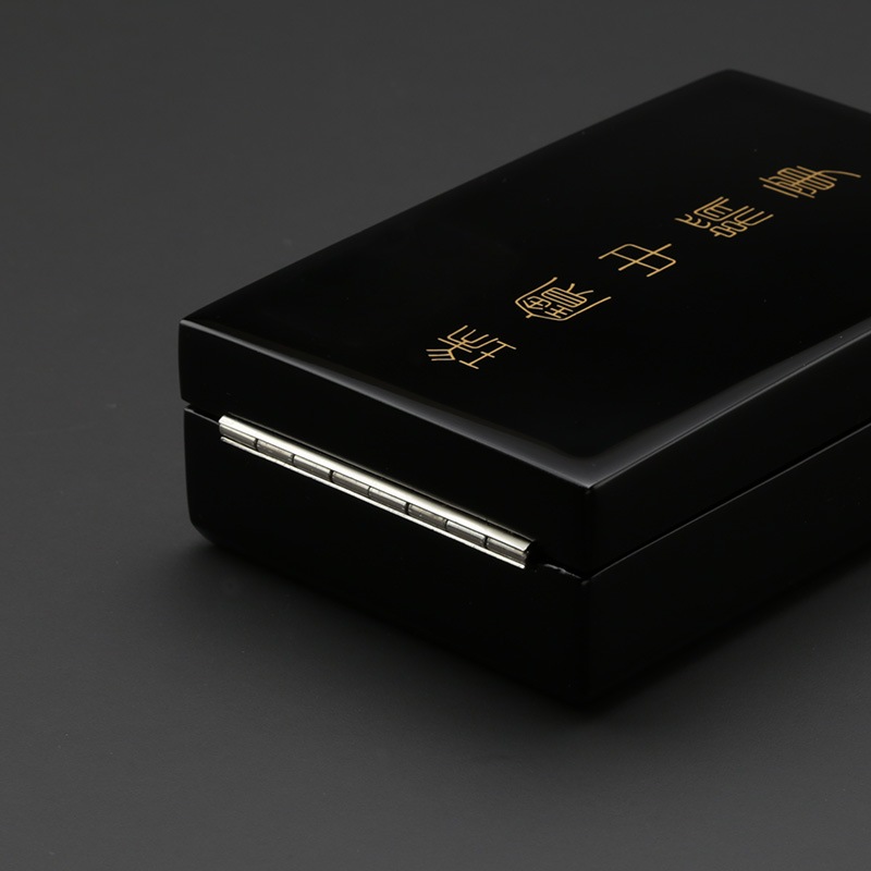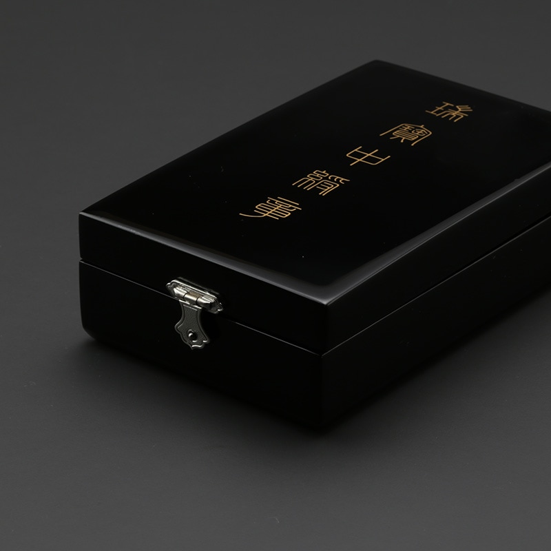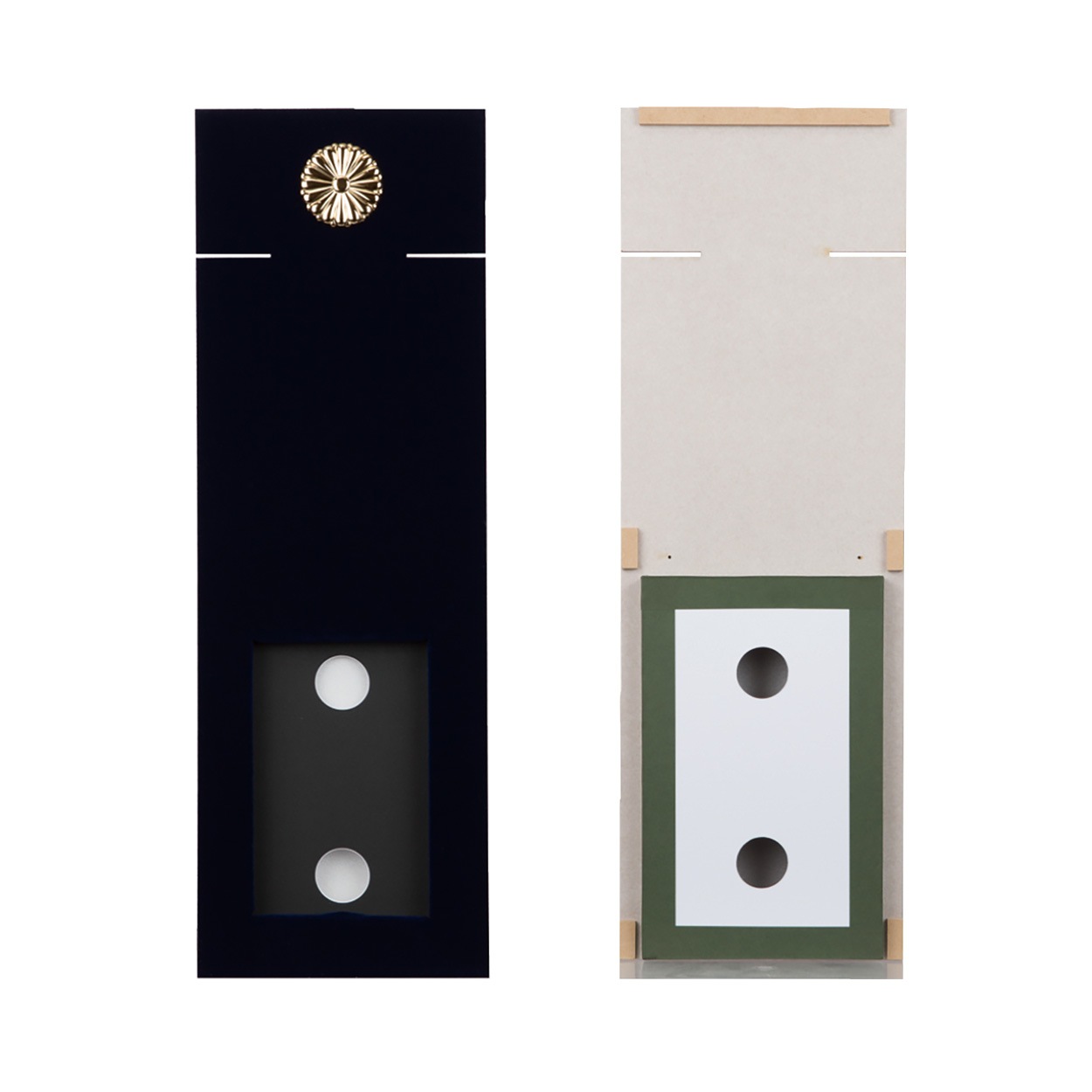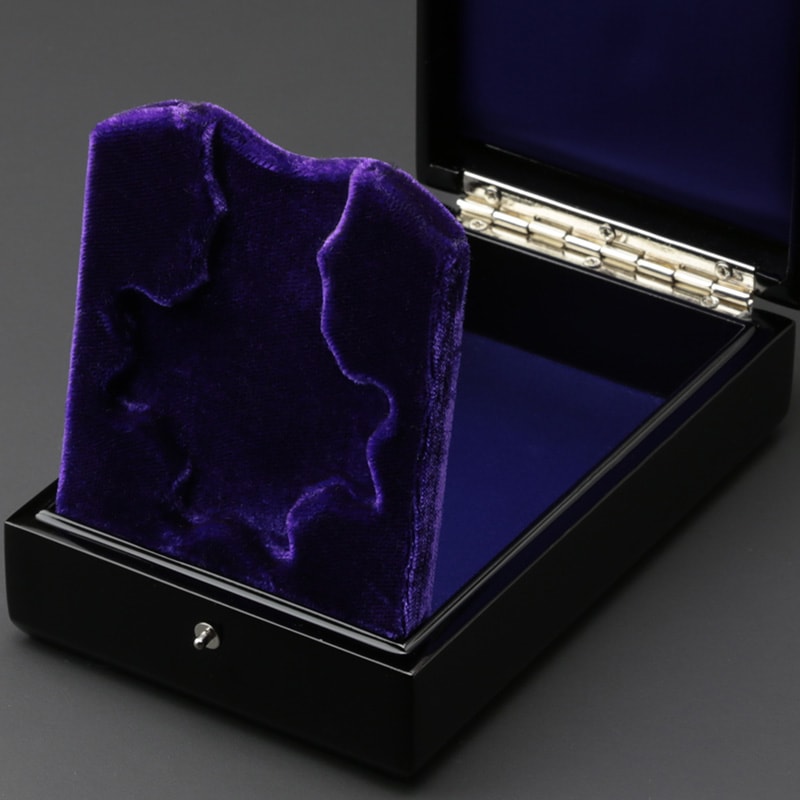 | 開発秘話 | 中綬章の受章者様のご要望を元に開発に至りました。額のサイズや厚みの検証を重ね、ケースの蓋部を外し立体的に飾れる仕様にしました。首に掛ける綬(リボン)は切れ目に通して裏側で畳んで収納します。調和が取れ美しく飾れると大変ご好評を頂いております。 |