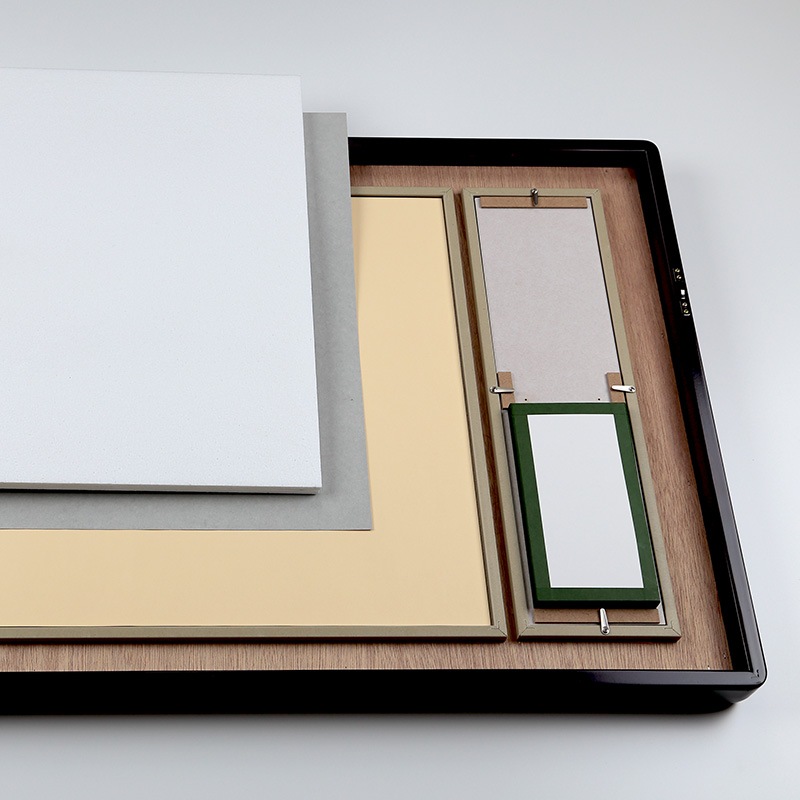 | 材質と額の接合 | [春秋DXシリーズ]:ヨーロピアンチェリー材(マホガニー塗装) 椅子・家具・楽器・彫刻などに使われる材質 [四隅の接合]:W接合のDX(デラックス)仕様を採用 ちぎり製法+高周波枠組接着 ちぎり製法とは、部材と部材の間に溝を彫り、別の部材を打ち込んで接着する際の補強とする接合方法。 さらに高周波枠組接着機で四隅同時に接着し、ズレを生じない堅牢な額に仕上げています。 |