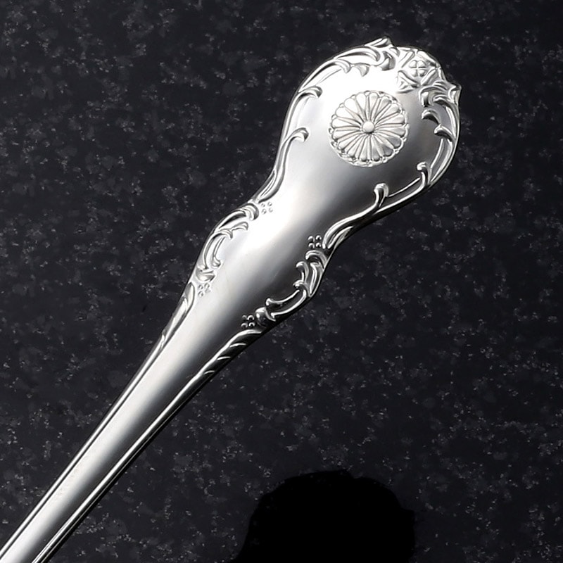 | 商品の紹介 | [銀製高級スプーン フレンチ] 装飾を最低限に抑えて菊花御紋章を際立たせたデザイン。 柄のラインが美しい銀製高級スプーン。 |