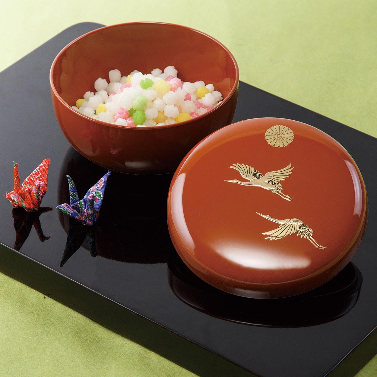 | ボンボン入れ 翔鶴 | 鶴の長寿にあやかりお慶び事の縁起物の代表とされ、愛情深く絆が強いことから夫婦円満・家内安全・長寿繁栄の象徴とされています。 ボンボン入れ:高8.0×径12.2cm 樹脂製・菊紋入 こんぺい糖:約100g 賞味期限 製造日から約6か月 化粧箱:約 高8.5×13.5×23.5cm ※日本製 |