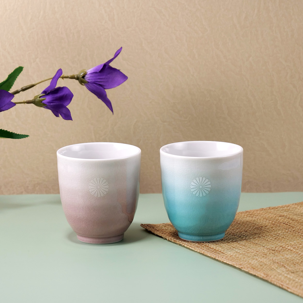 | 九谷焼みやび 組湯呑 ピンクと青のペア | 【松美堂オリジナル商品】 九谷焼の中で綺麗な色目を厳選し、二度焼きで菊紋をお入れしました。ひかえめながら美しい十六葉八重表菊が特徴で、幅広い世代の方にご愛用頂いています。 商品:高8.2×径7.4cm 容量:200ml 化粧箱:約 高8.5×10.5×17.0cm ※日本製(石川県) |
