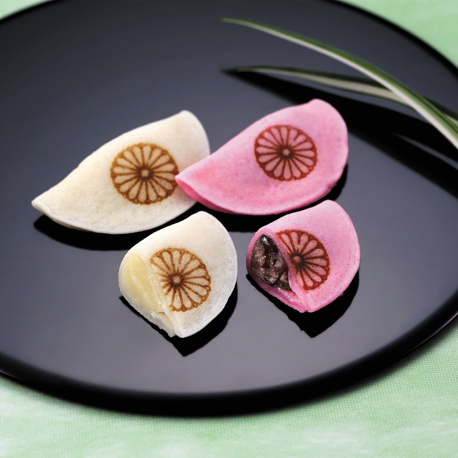| モチモチ 紅白残月5個入 | 「老舗和菓子店 不破福寿堂」のしっとりしたつぶ餡入りの紅残月と、白餡入りの白残月です。水を一切使用せず、米粉と牛乳を使ったモチモチ生地が特徴です。2つの味わいをお楽しみ頂けます。 お菓子:5.0×8.5cm(紅3個、白2個) 賞味期限:7日間 保存料不使用 化粧箱: 約 高3.0×21.5×14.5cm 個包装:菊紋シール付 ※富山県高岡市「不破福寿堂」 |
