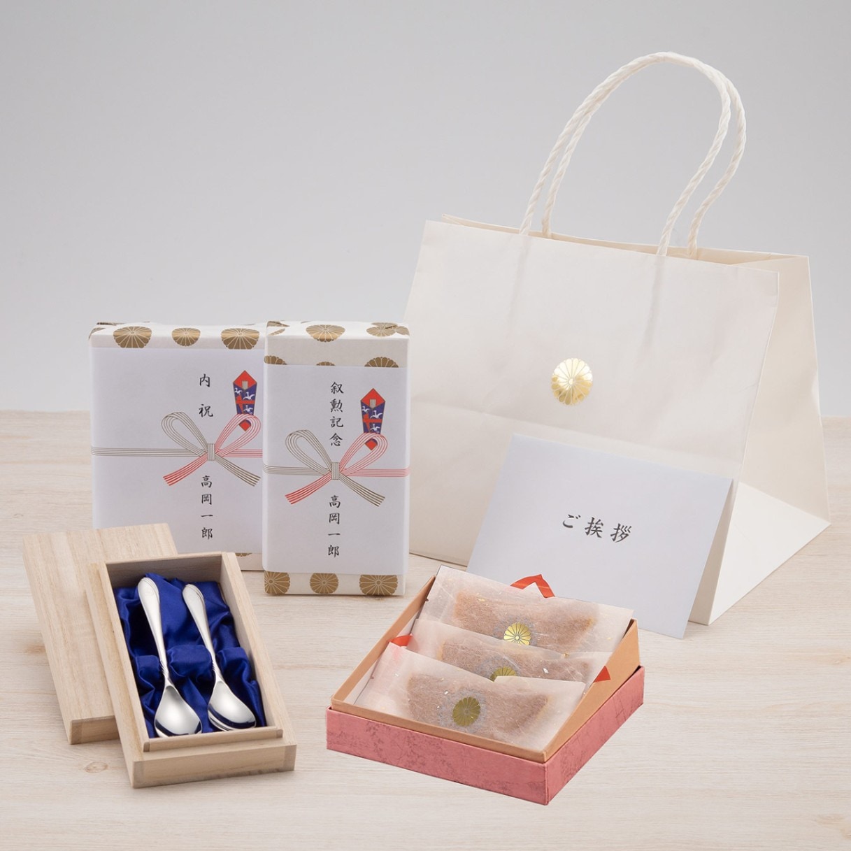 | 通販サイト限定セットプラン | 1セットの内容(¥3,320税込) ①高級スプーンマーメイド2本入:2,000円 ②残月 栗と抹茶3個入:1,200円 ③菊花御紋章入 手提げ袋 小サイズ:120円 ④ご挨拶状(鶴模様カードor大礼紙):サービス ⑤包装・のし掛け:サービス ※送料は別途かかります ※1セットからご注文頂けます |